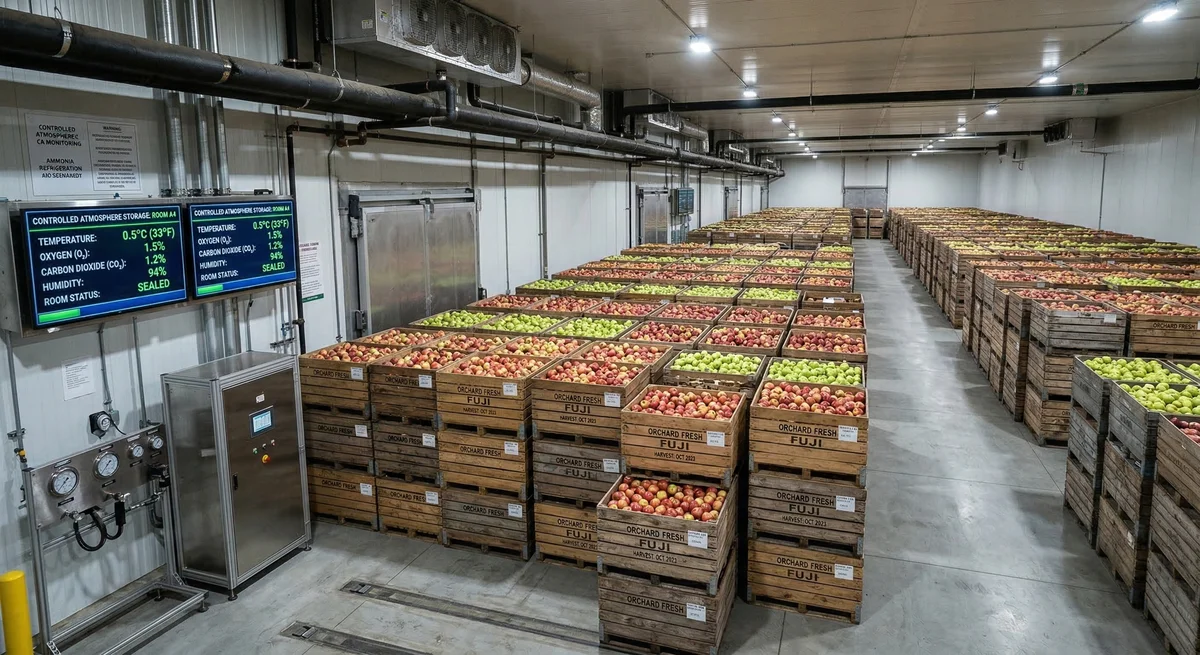 Beyond simple refrigeration, many fruits (like apples and pears) are stored in Controlled Atmosphere (CA) facilities. In these environments, oxygen levels are reduced and carbon dioxide levels are increased to 'put the fruit to sleep,' slowing down its natural respiration and ripening process.