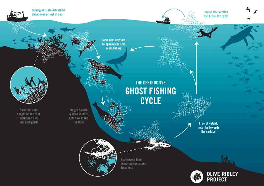 The mechanism of ghost fishing is a tragic feedback loop. A net catches a sea turtle; as the turtle decays, it attracts scavengers like sharks or crabs, who then also become entangled in the same net. This 'self-baiting' cycle can continue for decades until the net finally becomes so heavy with skeletons and barnacles that it sinks to the sea floor, where it continues to damage sensitive benthic ecosystems (FAO, 2009).