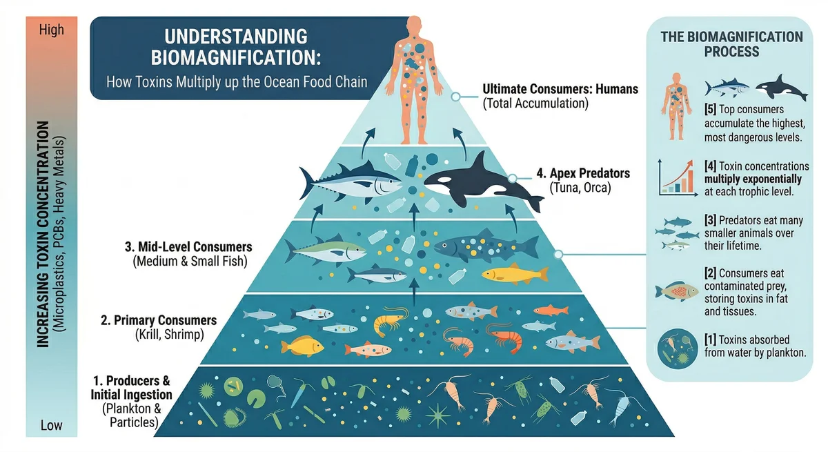 This is the process where toxin concentrations increase significantly at every level of the food chain. When a small fish eats 1,000 shrimp, it inherits all the toxins those shrimp accumulated. When a tuna eats 100 of those fish, the chemical concentration becomes dangerous (UNEP, 2016).