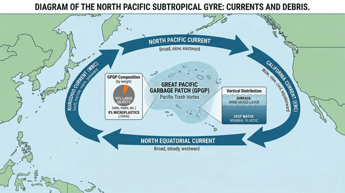 The Great Pacific Garbage Patch is held together by the North Pacific Subtropical Gyre. A gyre is a large system of circulating ocean currents, and this particular one is formed by four major currents moving in a clockwise direction. Think of it like a slow-motion whirlpool that spans the entire North Pacific Ocean. As these currents rotate, they pull debris toward a central, relatively calm area where the water moves very little, effectively trapping anything that floats (NOAA, 2023).